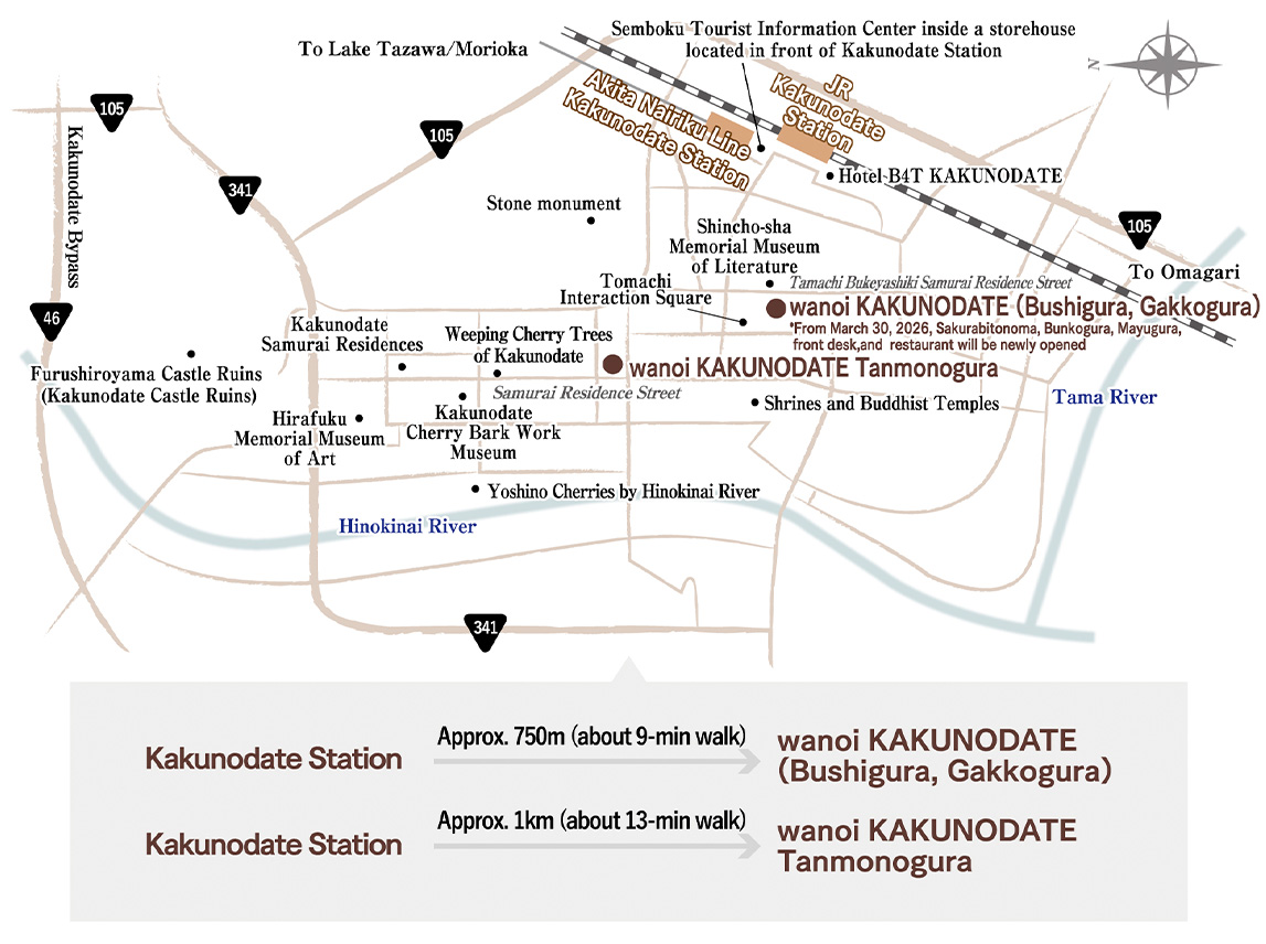 15:00~18:00 ※If you are going to arrive significantly later than 6:00 pm, please let us know in advance. *2 Check-in for Tanmonogura is also conducted at the front desk of wanoi Kakunodate. *3 The Bushigura, Bunkogura, Sakurabitonoma, Gakkogura, and Mayugura are located on the same premises as the front desk. |