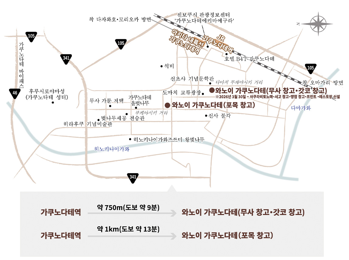 창고 스테이 ‘와노이 가쿠노다테’는 무사 가문 저택으로 유명한 리틀 교토 ‘가쿠노다테’ 마을 곳곳에 자리한 역사적 건축물을 새롭게 단장한 호텔입니다. 오래전 삶의 모습이 살아 숨 쉬는 공간에 몸을 누이고 좋았던 옛 시절 일본의 생활상을 만나면서 마치 시간을 뛰어넘어 당시의 생활 풍경으로 시간 여행을 떠난 듯한 감각을 즐기실 수 있습니다. 1일 1팀 한정의 프라이빗한 공간에서 고요함과 문화에 감싸인 평온하고 특별한 시간을 보내시기 바랍니다.