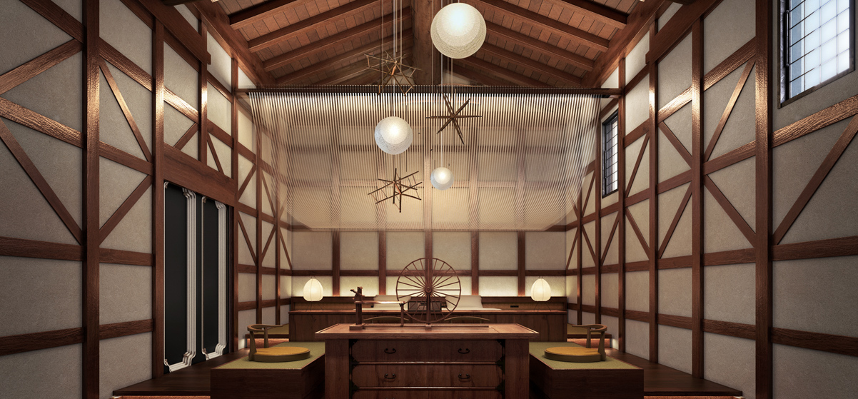 높은 천장과 거대한 대들보가 특징인 이 창고는 과거 양잠에 사용되었다고 전해집니다. 그러한 창고의 역사를 토대로 한, 누에고치와 실을 모티브로 수작업의 숨결이 느껴지는 생활 도구와 소품을 배치한 공간에서 창고에 포근히 감싸이는 듯한 시간을 보내실 수 있습니다.