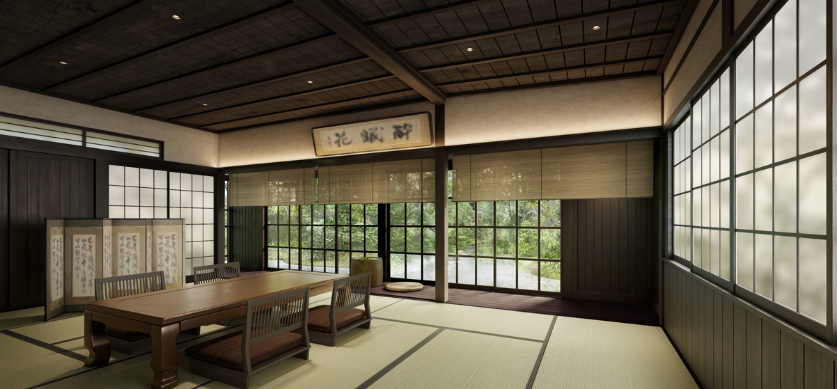 과거 가쿠노다테에 살던 이마미야가 가신단 중에서도 중진 가문이었던 니시노미야가. 그 니시노미야가의 안채에 딸린 별채가 '사쿠라비토노마'입니다. 사계절의 매력이 깃드는 툇마루를 비롯하여 정원의 수양벚나무가 여행의 흥취를 돋굽니다. 봄의 꽃, 여름의 초목, 가을의 단풍, 겨울의 눈. 니시노미야가의 주군이 사랑했던 경치를 시대를 초월하여 감상할 수 있습니다.