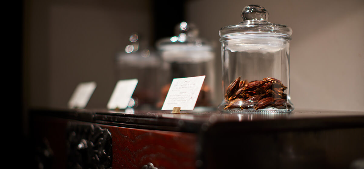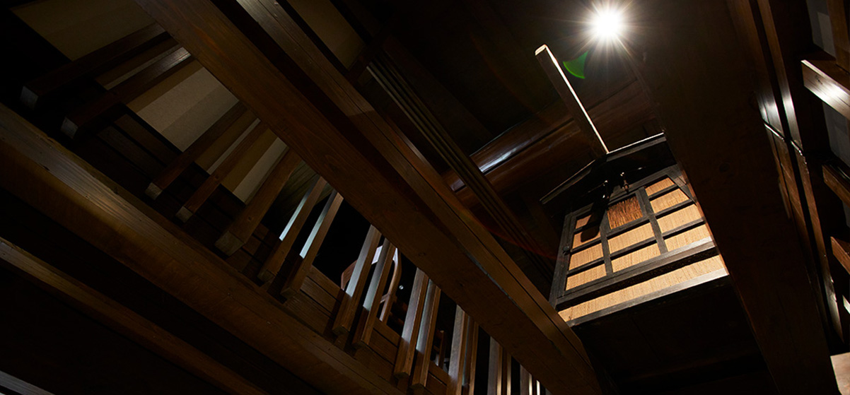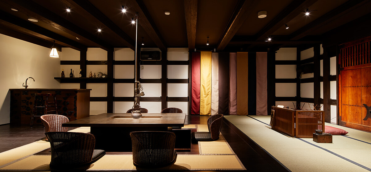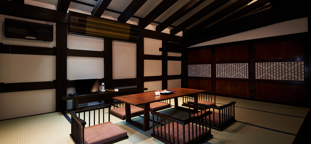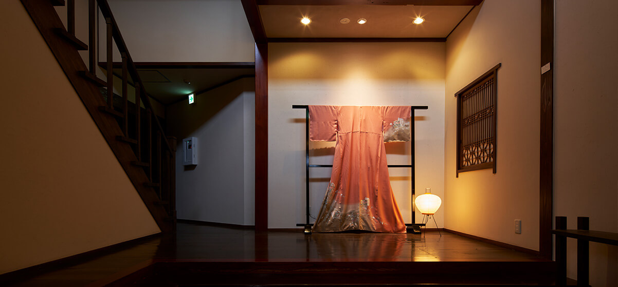 高い天井と大きな梁が特徴のこの蔵は、古くは養蚕が行われていたと伝わります。そんな蔵の歴史にちなみ、繭と糸をモチーフに、手仕事の息遣いが感じられる調度品を配置した空間では、蔵にやわらかく包み込まれるような時間をお楽しみいただけます。