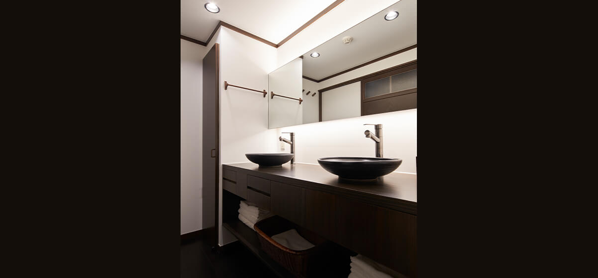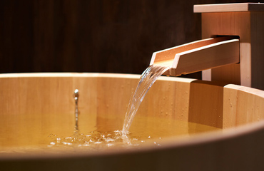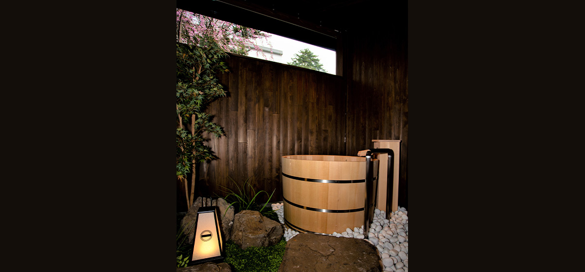 ガッコ(漬物)を貯蔵するのに使用されていた蔵の歴史を大切にし、漬物にまつわる道具等を空間デザインのアイテムやモチーフとして展開した空間を、お楽しみいただけます。浴槽も漬物樽をモチーフにしたもので、春には浴室にいながら桜を鑑賞することができます。